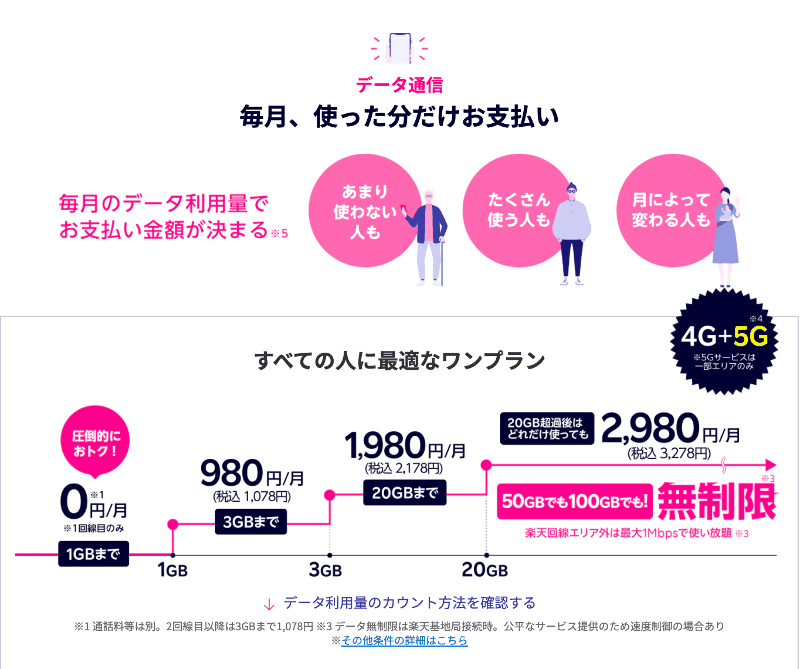 さらに、データを使い切った場合でも「データチャージ(330円(税込)/回)」で行えるため、パケットを使い切った場合でも容量を追加することで高速通信の継続が可能です。