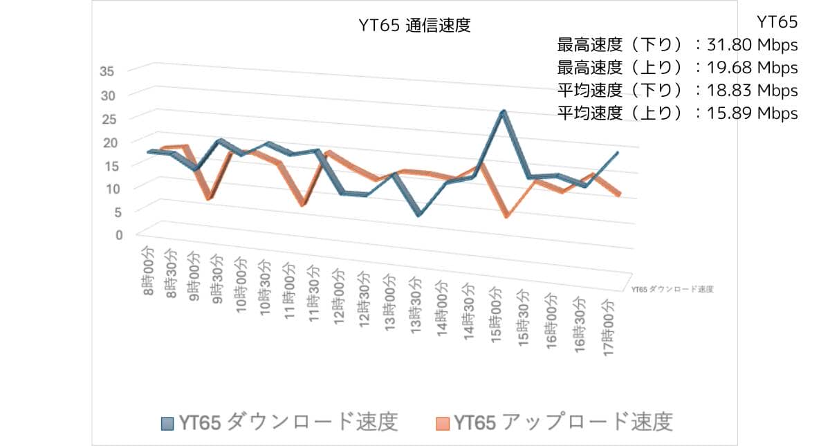 全体的にみると、YT65の方が下り/上り速度ともに好印象でした。