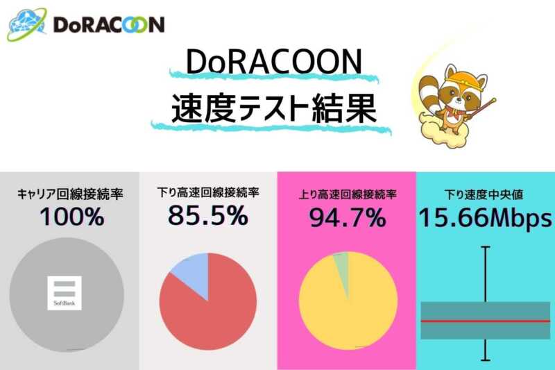 DoRACOONの下り速度の回線中央値は「15.66Mbps」、上り速度の回線中央値は「10.83Mbps」となりました。