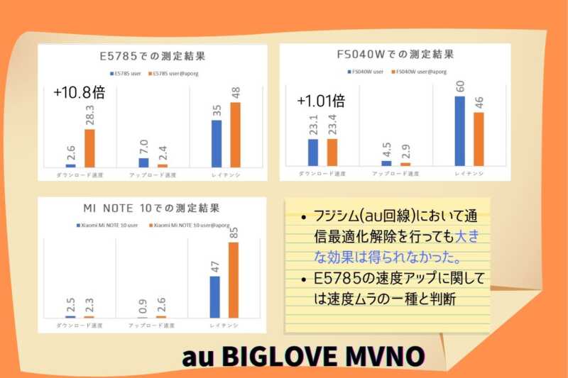 残念ながらauのSIMカードのみ通信速度が向上しなかったことに関しての考察は現時点では行えるほどの情報がありませんので割愛させていただきます。
