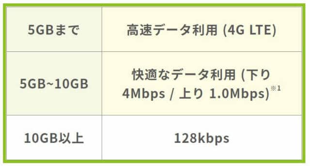 それが5GBを超えて~10GBまでは下り4Mbps /上り1Mbpsに制限され、さらに10GBを超えると128kbpsまで速度制限がかかります。