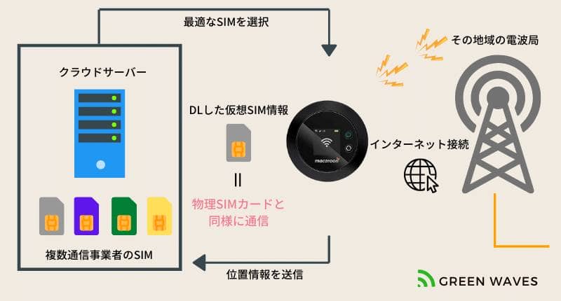 クラウドSIM型のポケット型WIFiは上記のように位置情報を確認した後にクラウドサーバー上にあるSIMカードデータをダウンロードして、通信を行います。