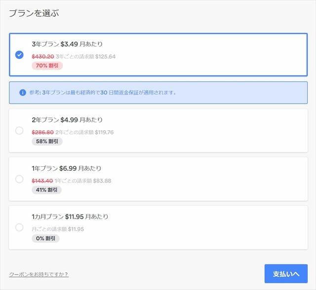 ※キャンペーン中につき、3年間の契約であれば通常料金の70%オフとなっています。