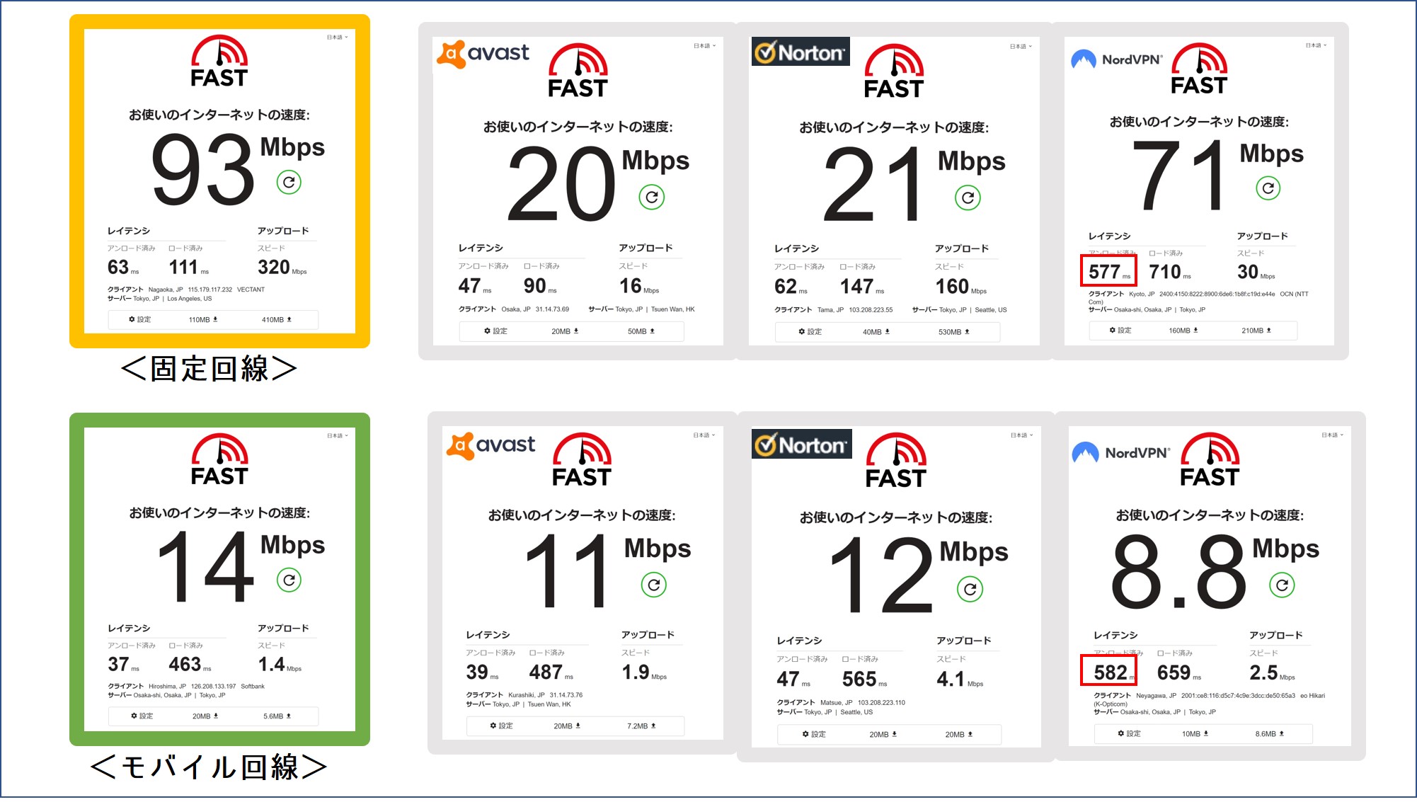 の3社の通信速度をVPN経由前後で比較しました。