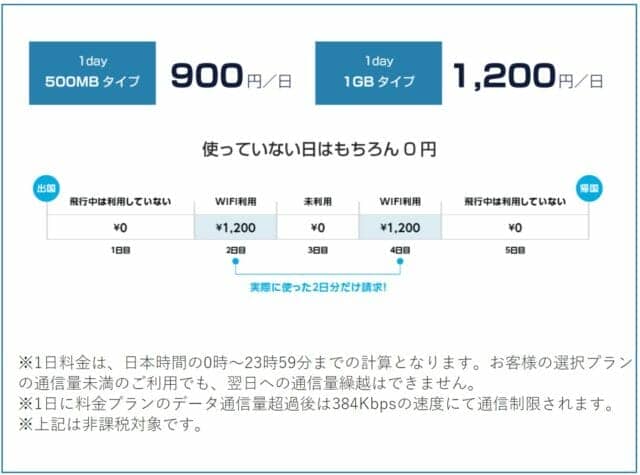 海外利用料金に関しては、国による利用料金の違いはなく、1日/500MBの利用で990円(税込)/日、1日/1GBの利用で1,320円(税込)/日となっています。