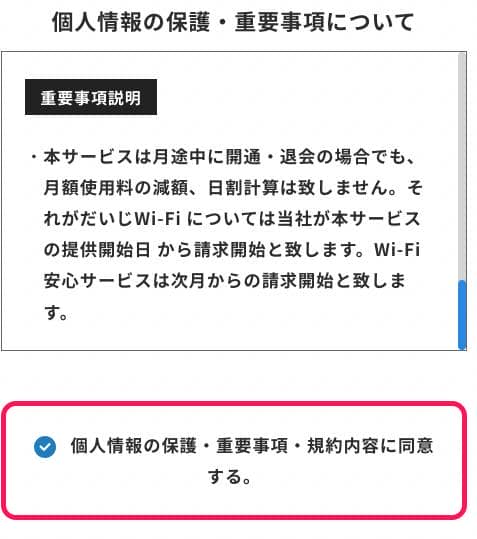 ④必要事項を入力し個人情報保護・重要事項・規約内容に同意する場合はチェックを入れます。