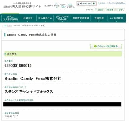 グループ名「Candy Foxx」の公式サイトURLが「studio candy foxx」となっているため、調べると、福岡県にある「Studio Candy Foxx株式会社(スタジオキャンディフォックス)」という企業がヒットします。