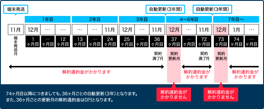 3年契約、契約期間内の違約金が最大27,280円と大変高額となっている一方で、契約時に支払うべき端末代金は無料となっています。